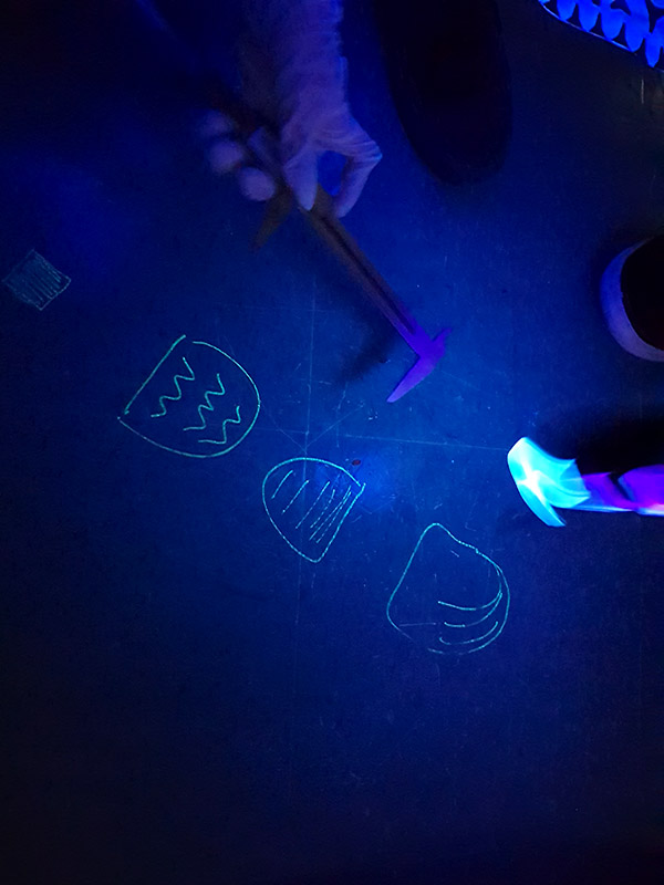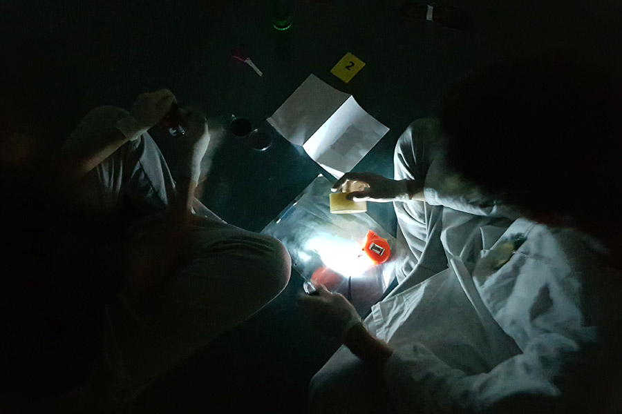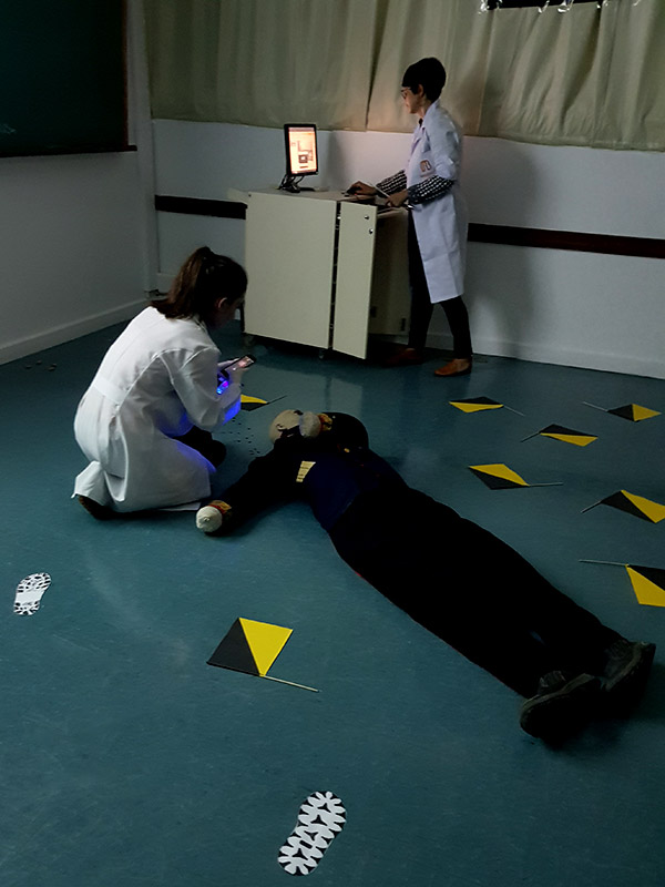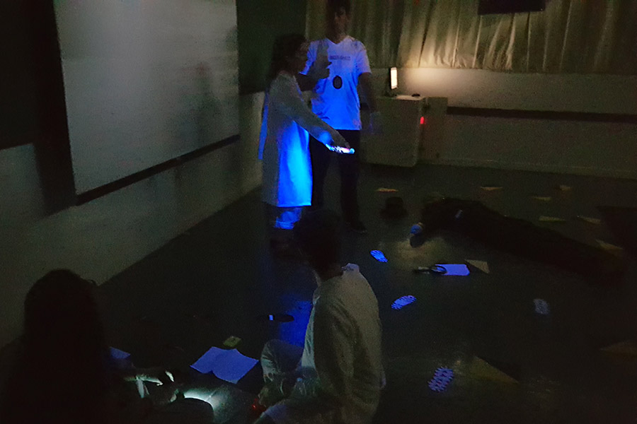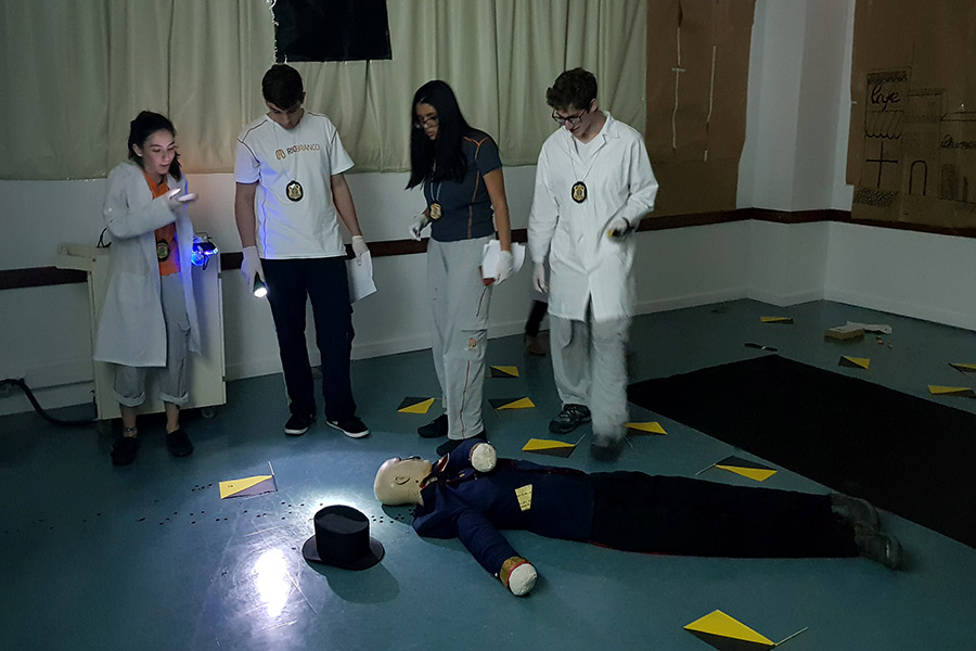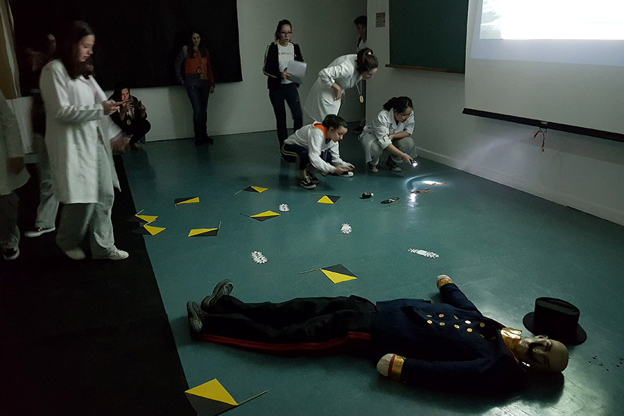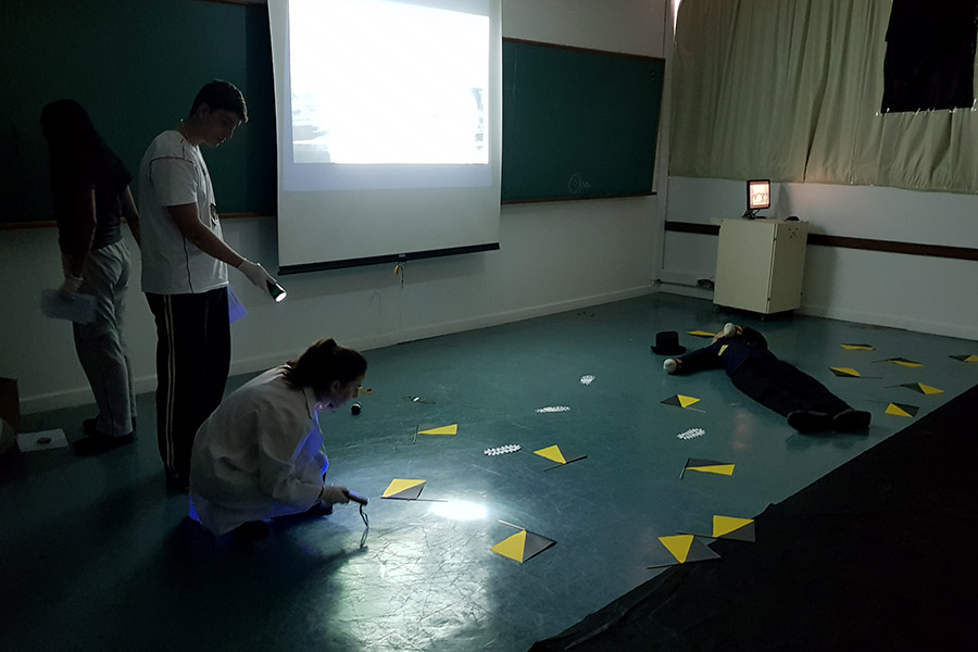 Ao longo da atividade, os alunos envolveram-se em diversas tarefas. Em um primeiro momento, aprenderam sobre a Ciência Forense e as principais técnicas empreendidas na análise da cena de um crime, com registro de informações, coleta de evidências e levantamento das primeiras hipóteses. Assim, foram abordados temas como Criminalística, Medicina legal, Balística Forense, Bioquímica, Biotecnologia, Perícia laboratorial, Papiloscopia e Análise e produção de Documentos. Com esse embasamento teórico, os alunos receberam os distintivos de peritos criminais e formaram as equipes de trabalho para análise da cena do crime e coleta de evidências, incluindo registro das primeiras hipóteses e análise de depoimentos de testemunhas.