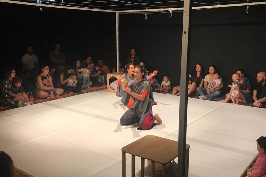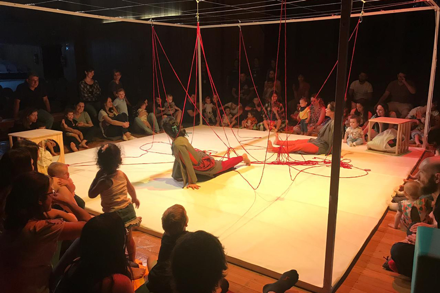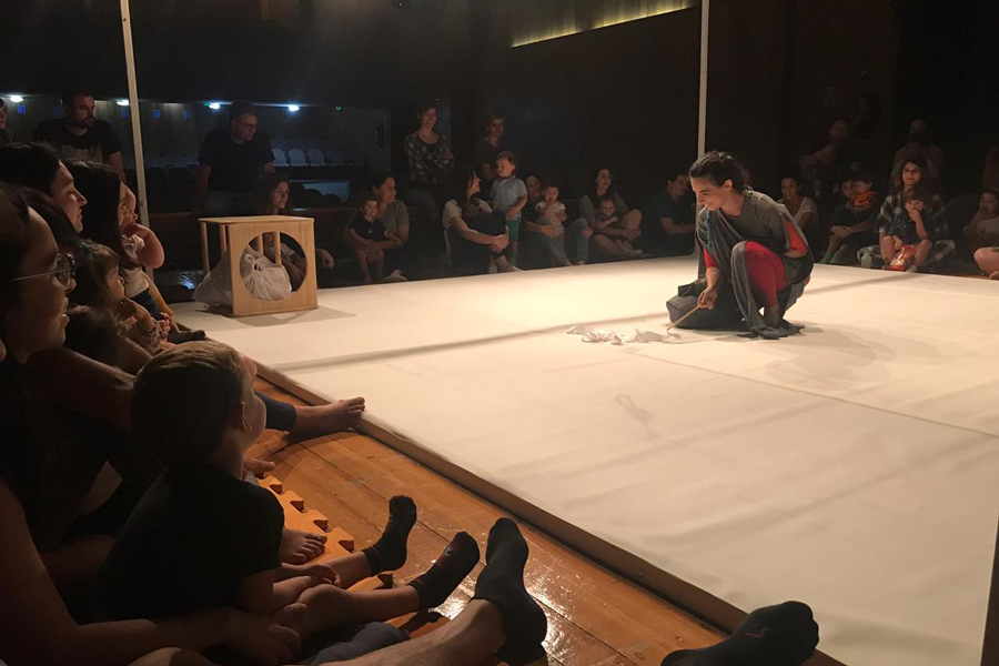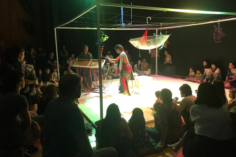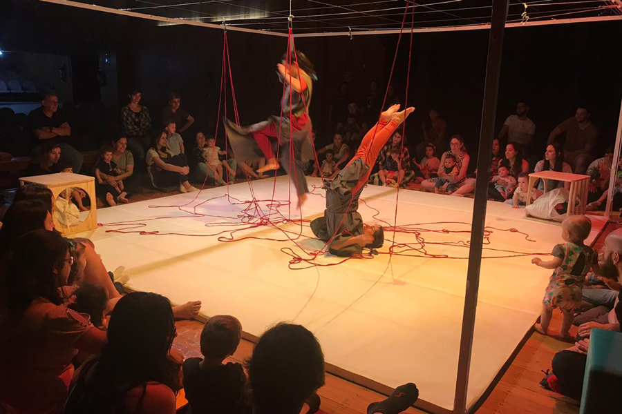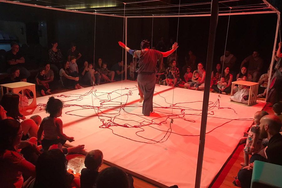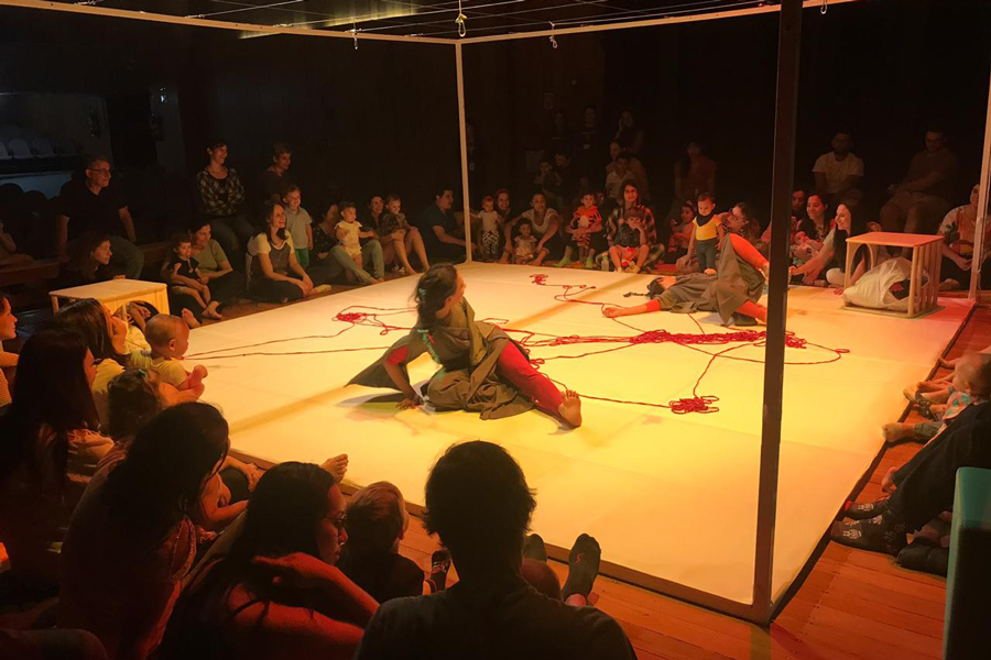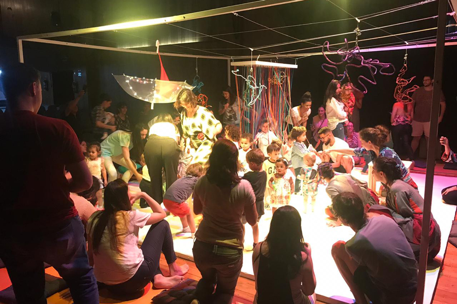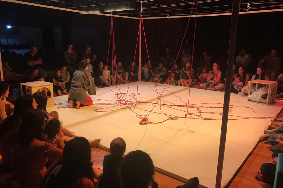 Nesta instalação performática, que envolve teatro e dança, as crianças puderam explorar objetos em cena com movimentos livres e criar seus primeiros traços, suas primeiras linhas.