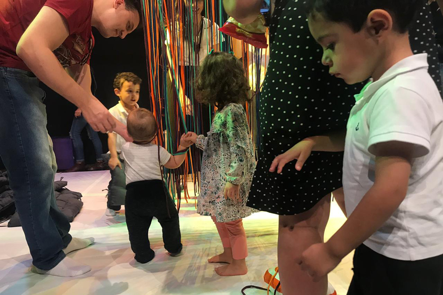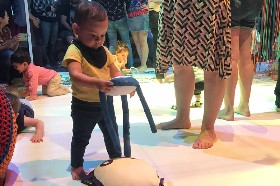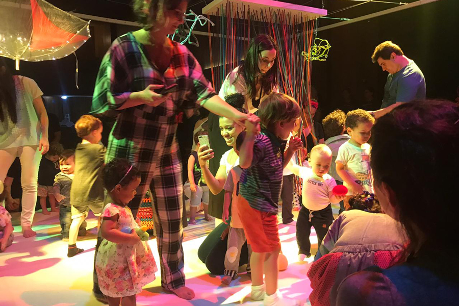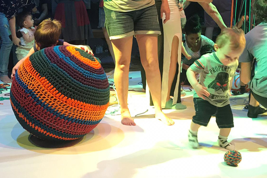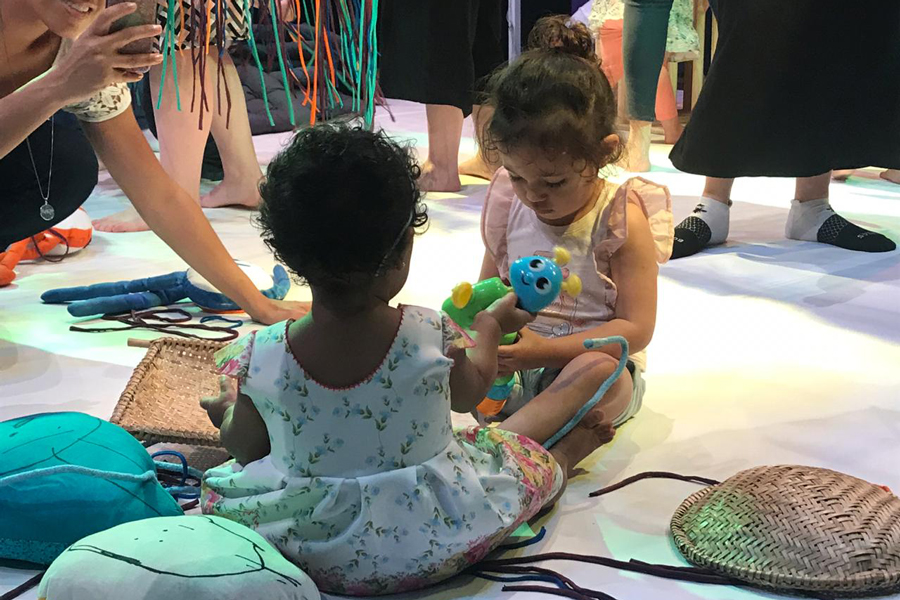Elementos como bolas, bambolês, arames coloridos e fios de malha compuseram o cenário que, ao final, se transformou em um grande cubo sensorial, um espaço em que os bebês puderam explorar livremente todos os materiais.