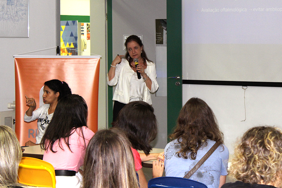 A fonoaudióloga Rosana Marques falou sobre os aspectos de linguagem, destacando as expectativas para a aquisição de conceitos básicos da fala e dos sons da fala e como a escola é essencial no apoio e na identificação de desvios audiológicos e oftalmológicos, pois situações de sala de aula podem apoiar diagnósticos.