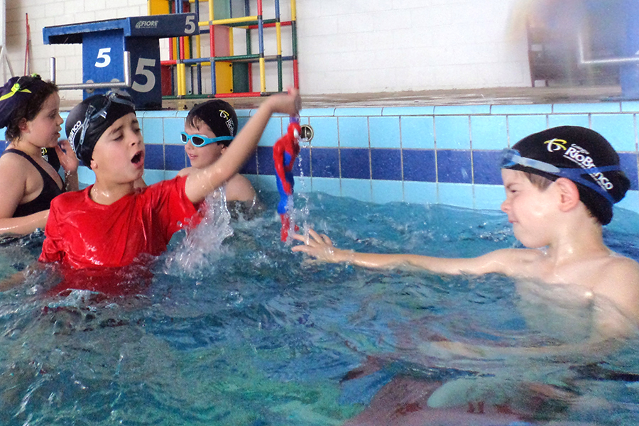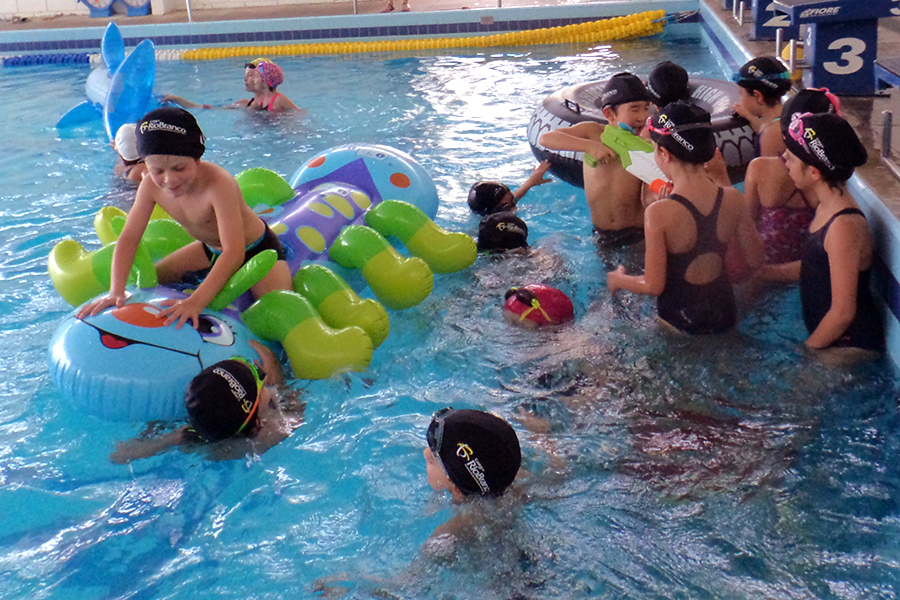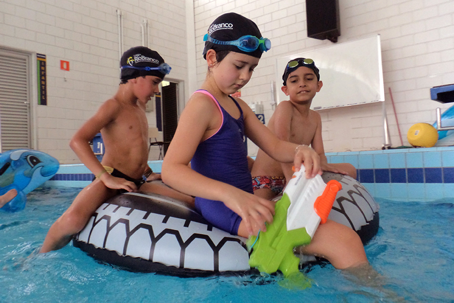 Em clima de muita diversão, alegria e descontração, os alunos que integram a atividade extracurricular de Natação no Colégio Rio Branco, Unidade Granja Vianna, participaram de uma atividade especial com Brinquedos, para comemorar a Semana da Criança.