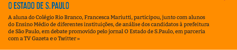 Você está cadastrado na base de dados do Colégio Rio Branco, que respeita a sua privacidade e é contra o spam na rede. Adicione nosso e-mail comunicados@mail.comunicacrb.com.br aos seus contatos para receber com sucesso nossos e-mails. Os assuntos dos e-mails podem, eventualmente, aparecer sem acentuação porque alguns servidores não a reconhecem. Este é um e-mail automático. Por favor, não responda. Para entrar em contato conosco, mande uma mensagem através do nosso canal de relacionamento. Colégio Rio Branco | www.crb.g12.br |