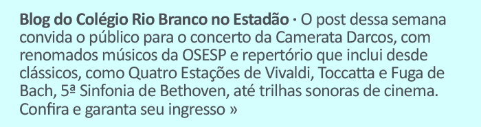 Blog do CRB no Estadão - O post dessa semana convida o público para o concerto da Camerata Darcos, com renomados músicos da OSESP e repertório que inclui desde clássicos, como Quatro Estações de Vivaldi, Toccatta e Fuga de Bach, 5ª Sinfonia de Bethoven, até trilhas sonoras de cinema. Confira e garanta seu ingresso