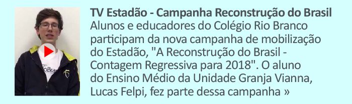 TV Estadão - Campanha Reconstrução do Brasil - Alunos e educadores do Colégio Rio Branco participam da nova campanha de mobilização do Estadão, "A Reconstrução do Brasil - Contagem Regressiva para 2018". O aluno do Ensino Médio da Unidade Granja Vianna, Lucas Felpi, fez parte dessa campanha