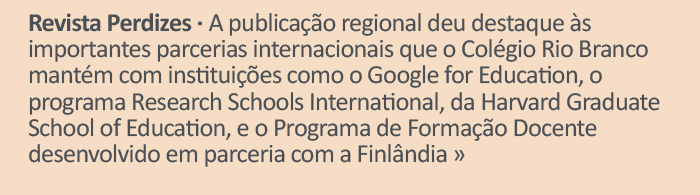 Revista Perdizes: A publicação regional deu destaque às importantes parcerias internacionais que o Colégio Rio Branco mantém com instituições como o Google for Education, o Research Schools Projects International, da Harvard Graduate School of Education, e o Programa de Formação Docente desenvolvido em parceria com a Finlândia.