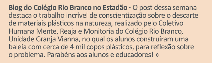 Blog do CRB no Estadão: O post dessa semana destaca o trabalho incrível de conscientização sobre o descarte de materiais plásticos na natureza, realizado pelo Coletivo Humana Mente, Reaja e Monitoria do Colégio Rio Branco, Unidade Granja Vianna, no qual os alunos construíram uma baleia com​ ​cerca de 4 mil copos plásticos, para reflexão sobre o problema. Parabéns aos alunos e educadores!
