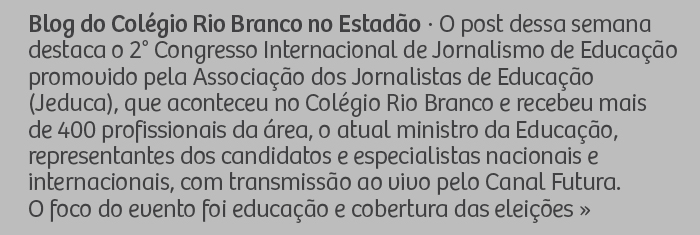 Você está cadastrado na base de dados do Colégio Rio Branco, que respeita a sua privacidade e é contra o spam na rede. Adicione nossos e-mails comunicados@mail.comunicacrb.com.br e frsp-mkt@mkt.frsp.org aos seus contatos para receber com sucesso nossos e-mails. Os assuntos dos e-mails podem, eventualmente, aparecer sem acentuação porque alguns servidores não a reconhecem. Este é um e-mail automático. Por favor, não responda. Para entrar em contato conosco, mande uma mensagem através do nosso canal de relacionamento. Colégio Rio Branco | www.crb.g12.br |