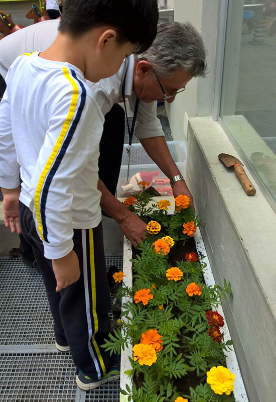 Gerson Francisco do Ó, líder de Manutenção e Serviços Gerais, na Unidade, foi convidado carinhosamente para ser o padrinho do Green Club e ensinou as crianças a plantarem diferentes flores nas jardineiras, juntamente com as professoras.