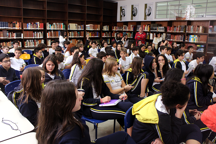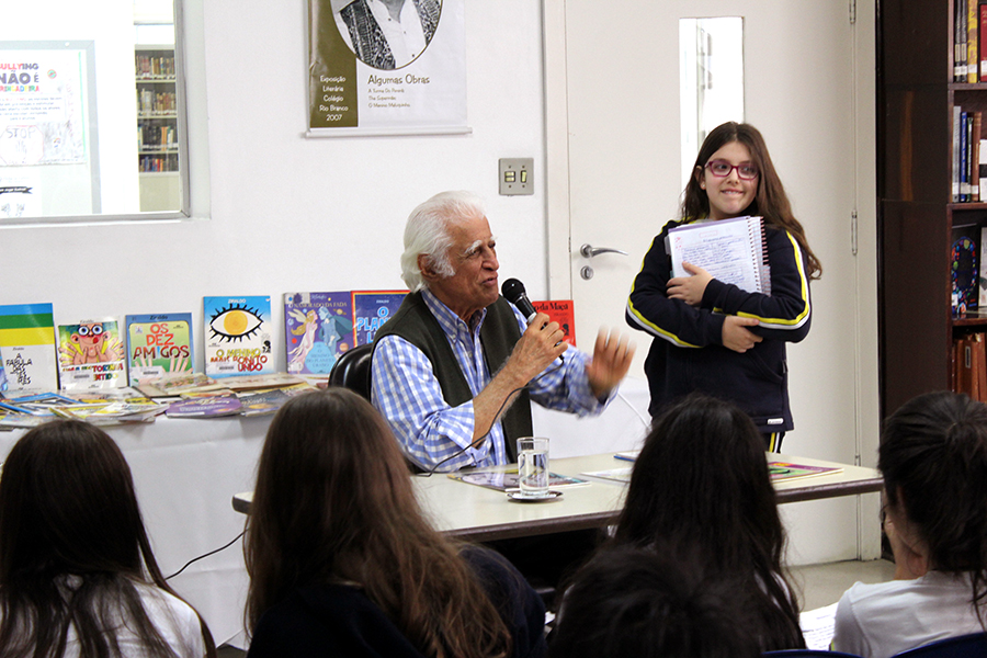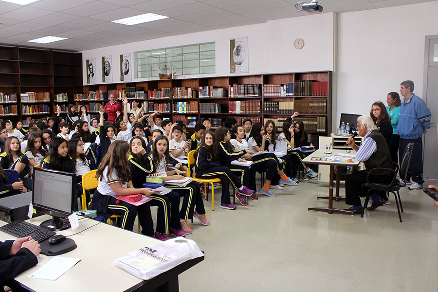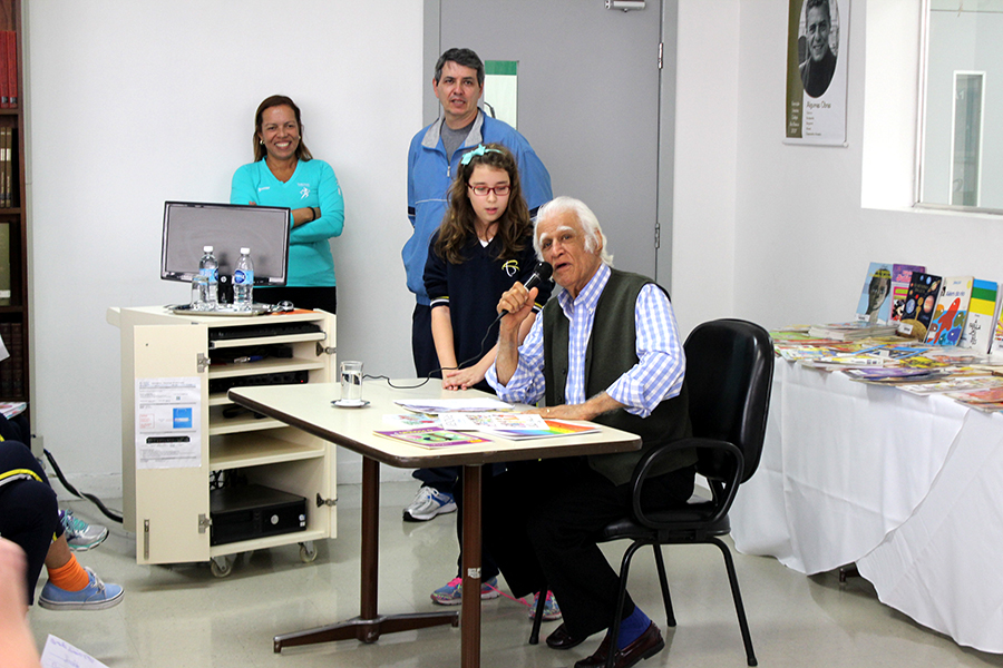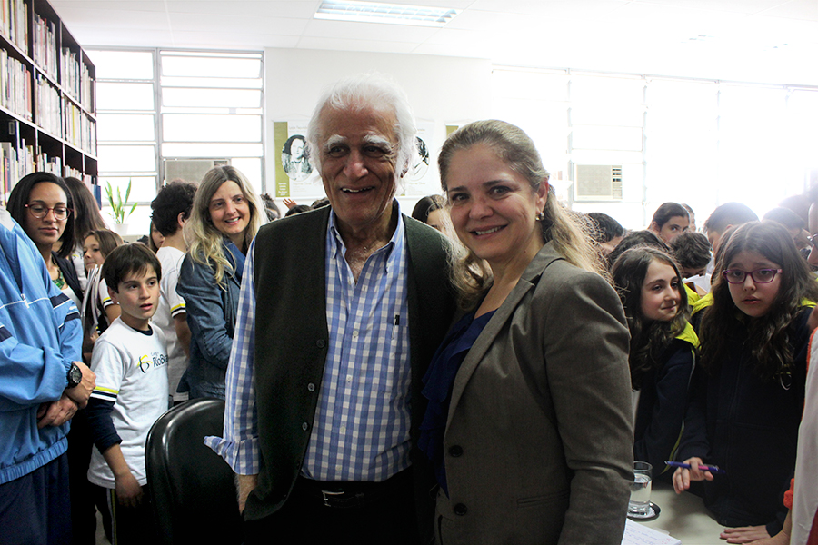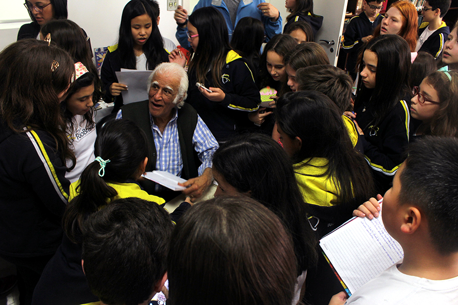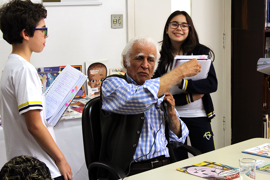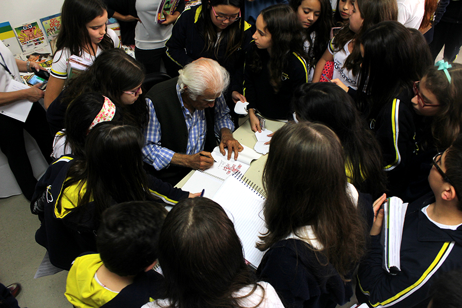 Os alunos do 6º ano do Ensino Fundamental puderam escutar suas histórias do autor de livros, como “O Menino Maluquinho”, “O Bichinho da Maçã” e “O Menino do Rio Doce”, conhecer suas inspirações, tirar algumas dúvidas e curiosidades, além de tirar fotos e ganhar autógrafos. Também acompanharam Ziraldo desenhar seu personagem mais famoso. Confira!