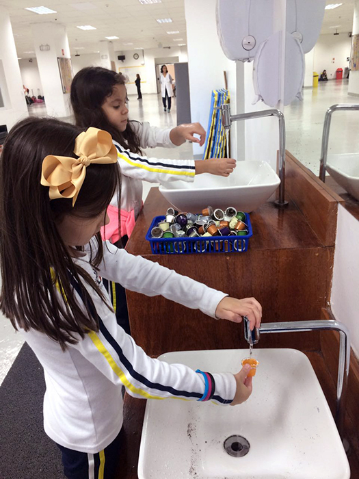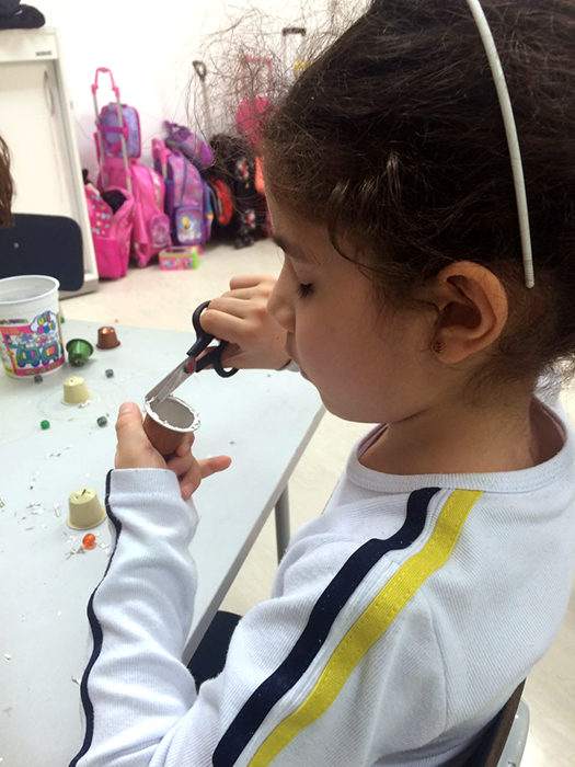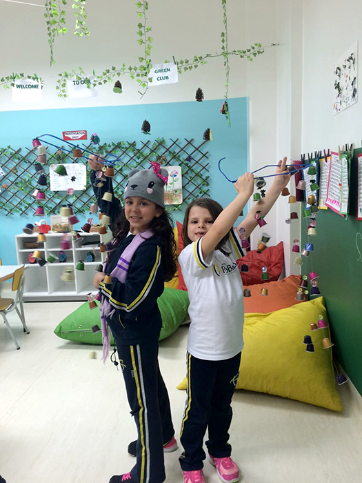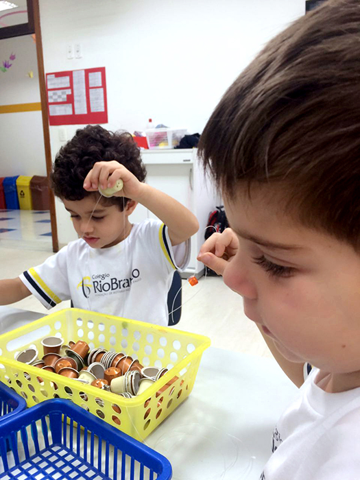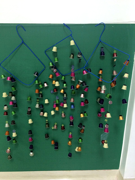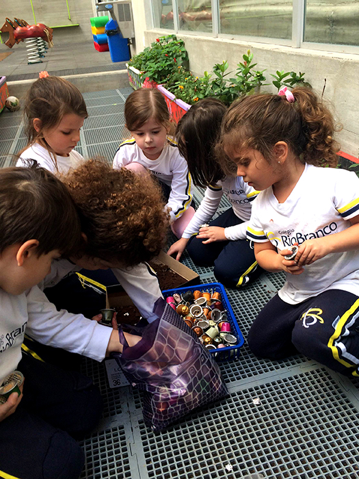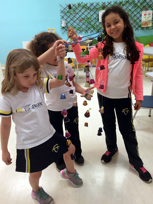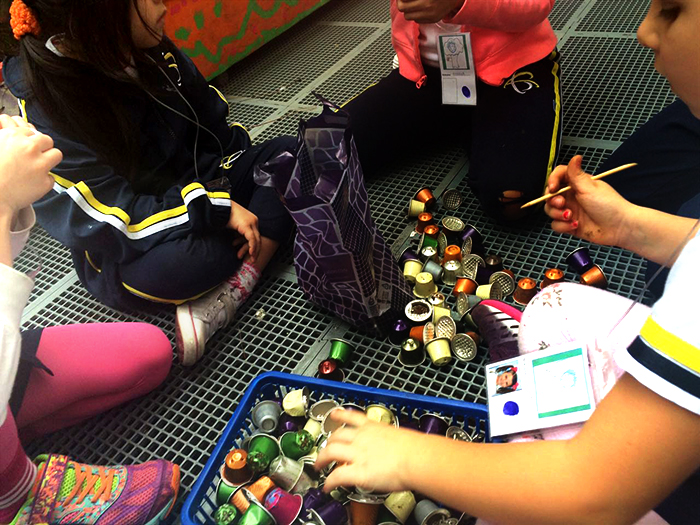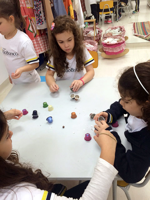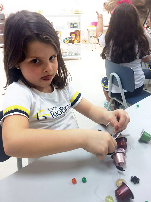 A professora Luana Andrade levou para a sala de aula, durante o Green Club, muitas cápsulas de café expresso, para que as crianças vivenciassem todo o processo de reciclagem de um material. Os alunos passaram pelo processo de revalorização, que consiste na limpeza e descontaminação do material coletado para que possa ser utilizado como matéria-prima. O grupo, então, ao limpar as cápsulas, ficou pensando em como dar outra função ao material.