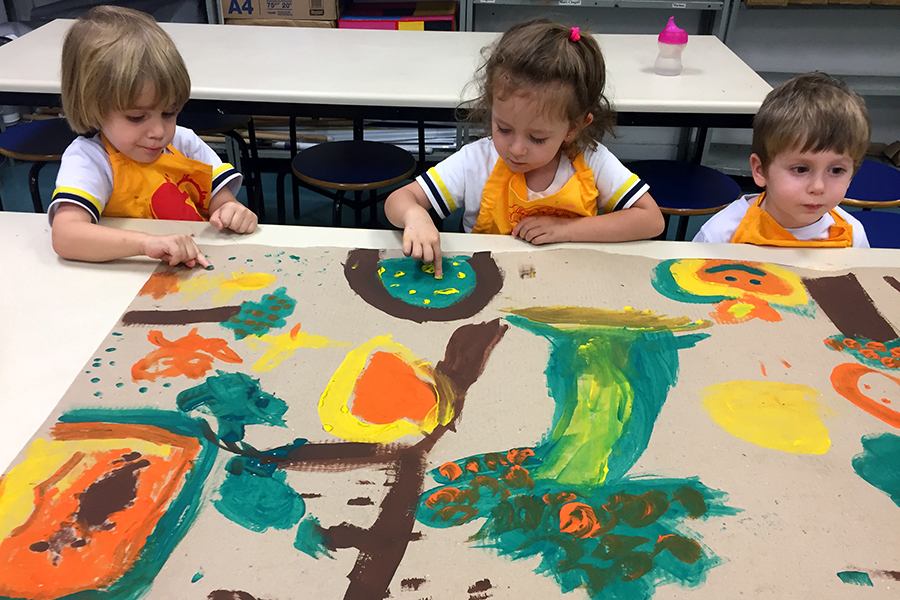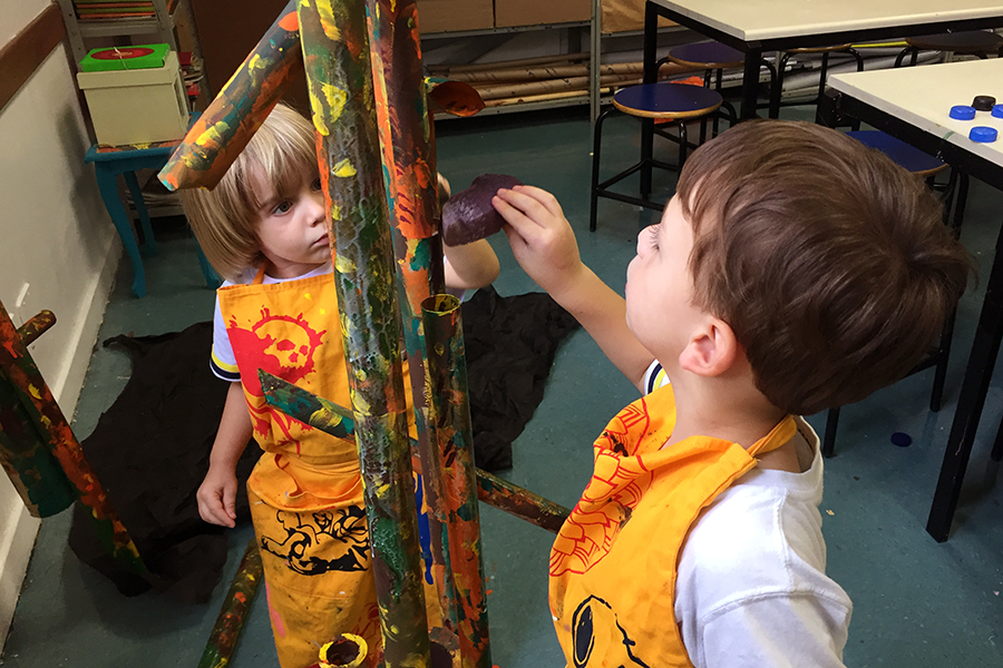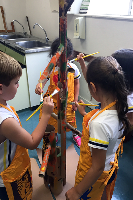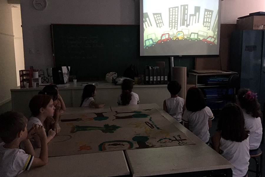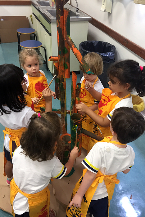 Durante a atividade, as crianças assistiram a um vídeo educativo da coleção, “A Natureza Sabe Tudo”, para ilustrar a importância das ações coletivas e construíram todos juntos um tronco, representando uma obra de arte feita em equipe. Utilizando rolos de papelão e tintas para colorir, desenharam e pintaram troncos e árvores em um grande painel e utilizaram tampinhas de plástico para fazer esculturas, representando a natureza.