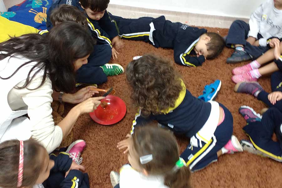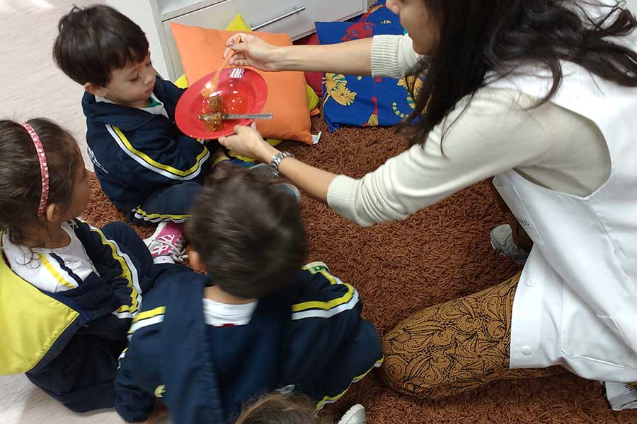 Durante uma atividade no bosque com a professora Ariane Rebelatto, os alunos discutiram sobre as abelhas e fizeram diversas perguntas: Como as abelhas se organizam? Por que elas picam? Por que gostam de flores? Como produzem o mel?