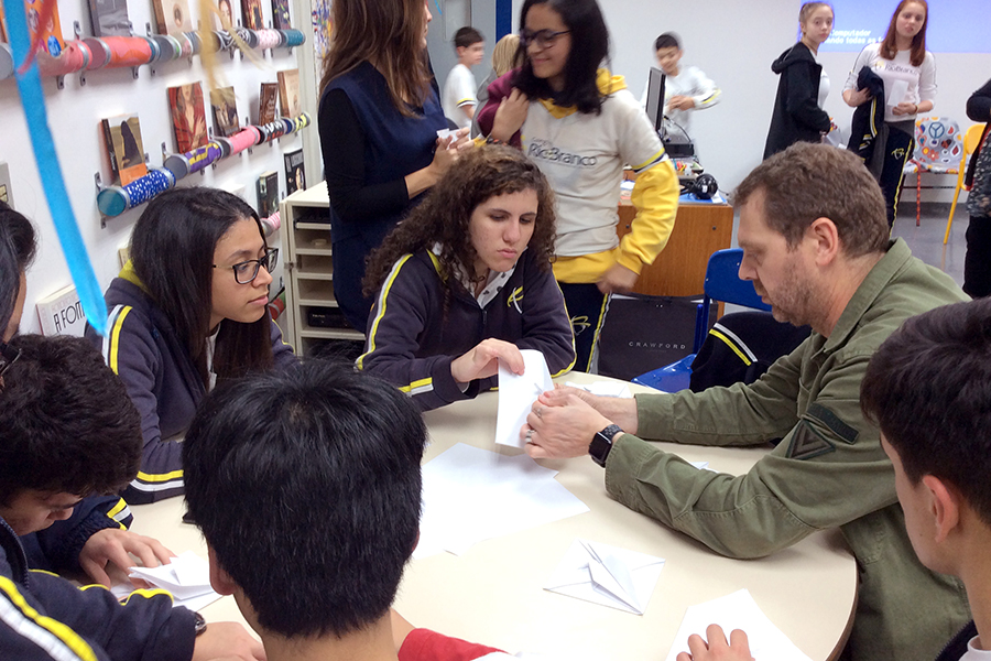 Durante o bate-papo, os alunos aprenderam sobre a história do Origami e, ainda, conheceram um pouco sobre o convidado, profissional da aviação há quase 30 anos. Alexandre contou como iniciou sua carreira na aviação, como o Origami entrou na sua vida e se tornou, também, uma profissão rentável durante muitos anos.