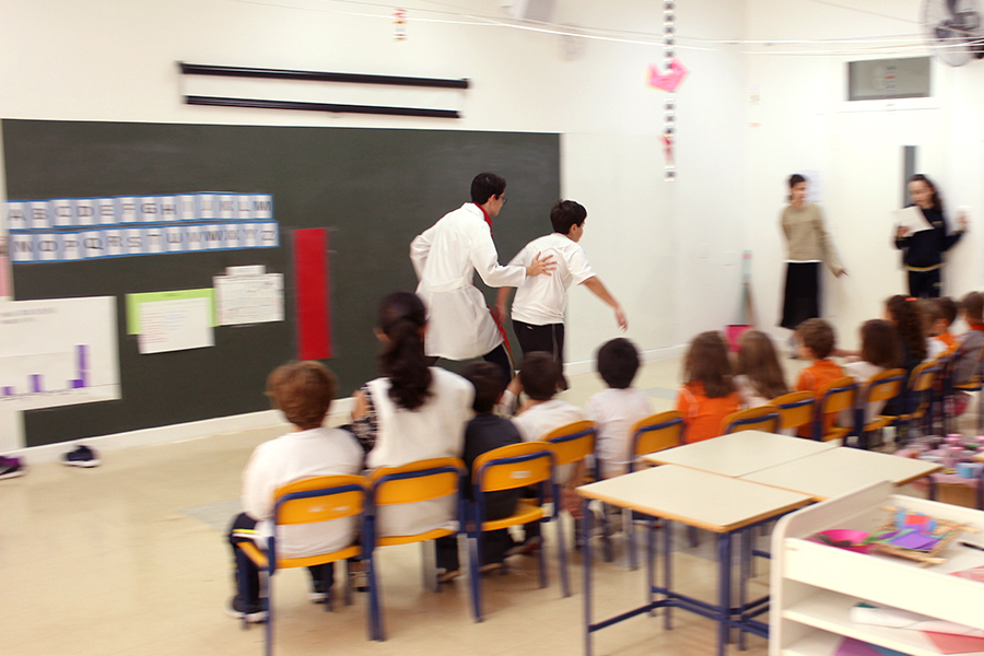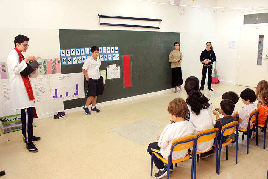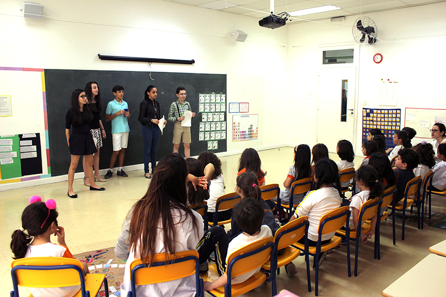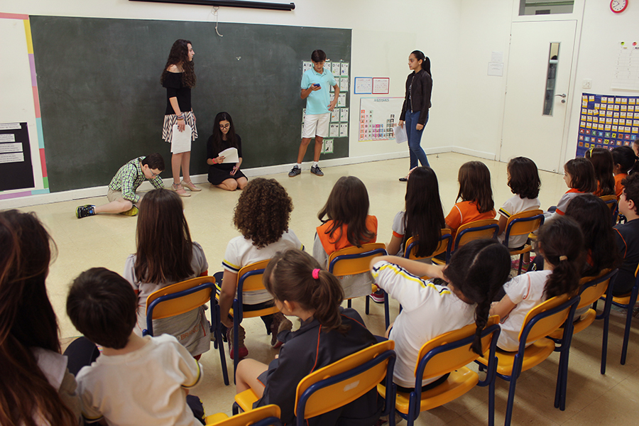 Os alunos apresentando a peça em Espanhol para os alunos da Educação Infantil