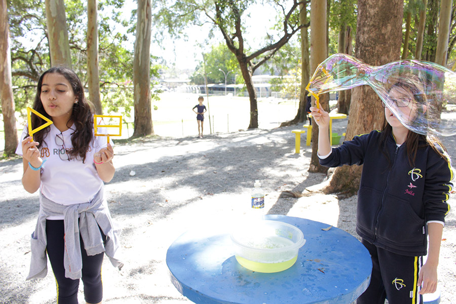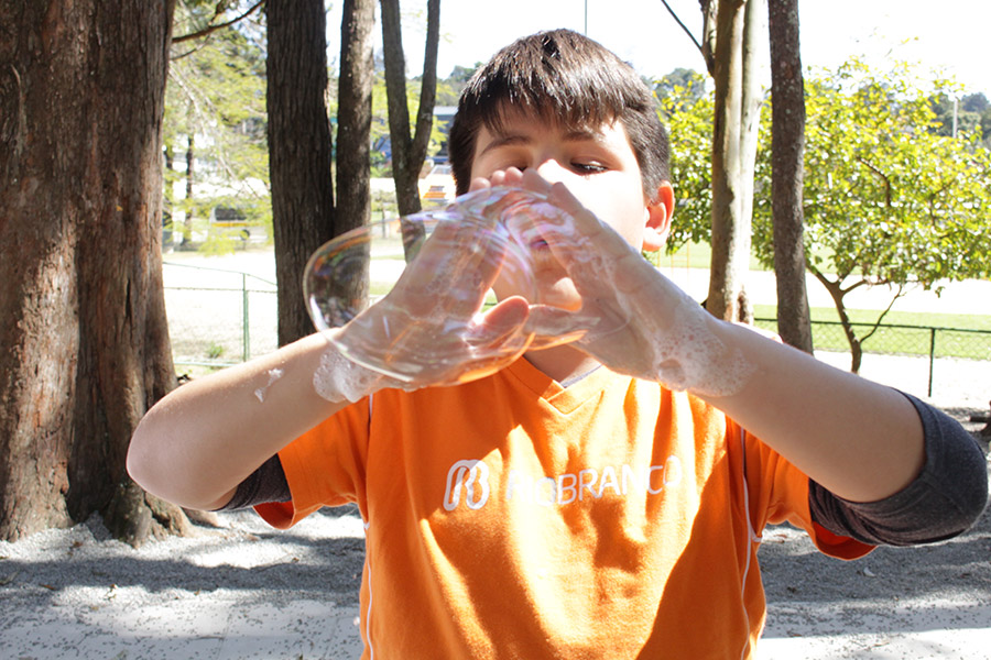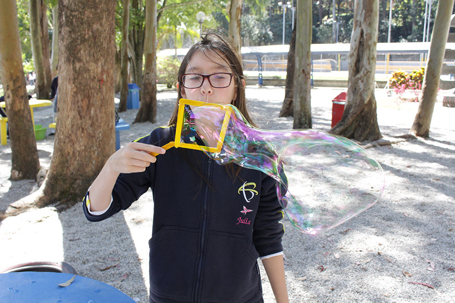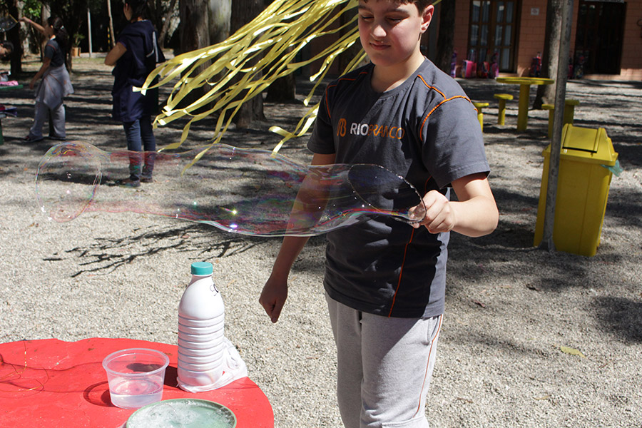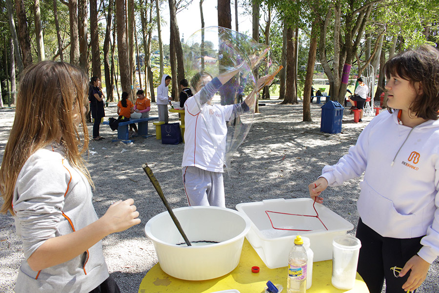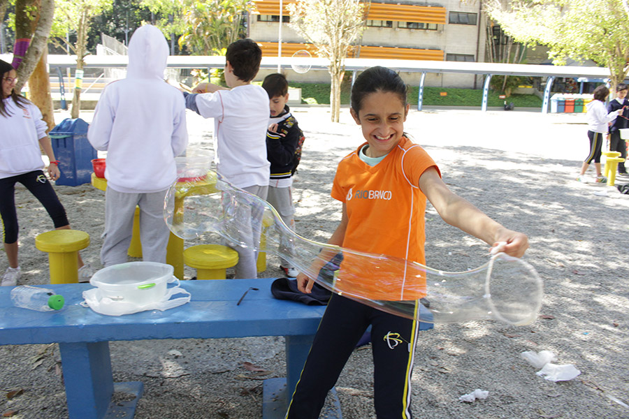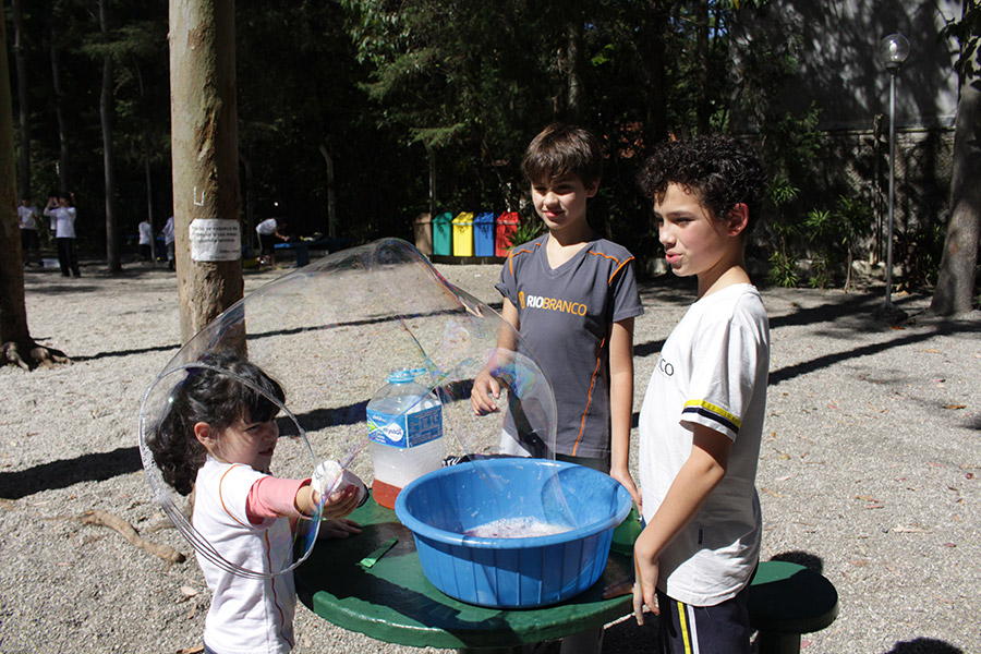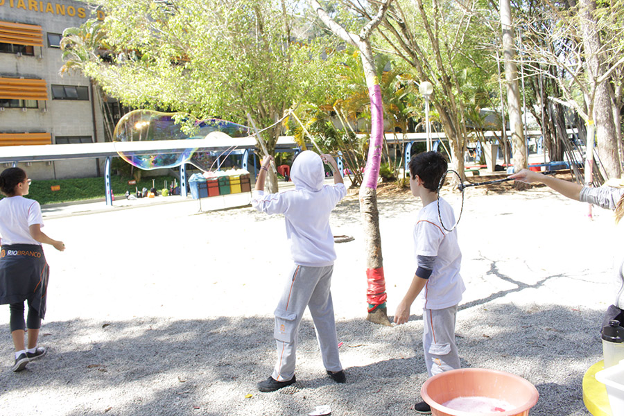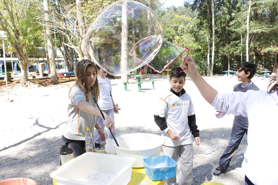 Os alunos do 6° ano do Ensino Fundamental da Unidade Granja Vianna realizaram um lindo trabalho sobre Atmosfera, utilizando a construção de bolhas de sabão como forma de ilustração e ludicidade, com a presença e visita das crianças do Jardim I.