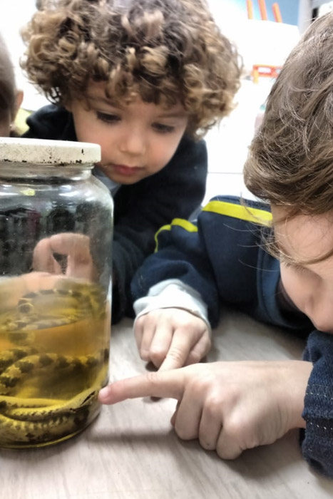 “As crianças prepararam as perguntas para a conversa com a professora e trocaram informações com a bióloga. Foi uma manhã bem produtiva! E ainda, construíram na sala de aula, um museu com alguns animais que pretendemos estudar, como o escorpião e as cobras”, contou a professora Ariane.