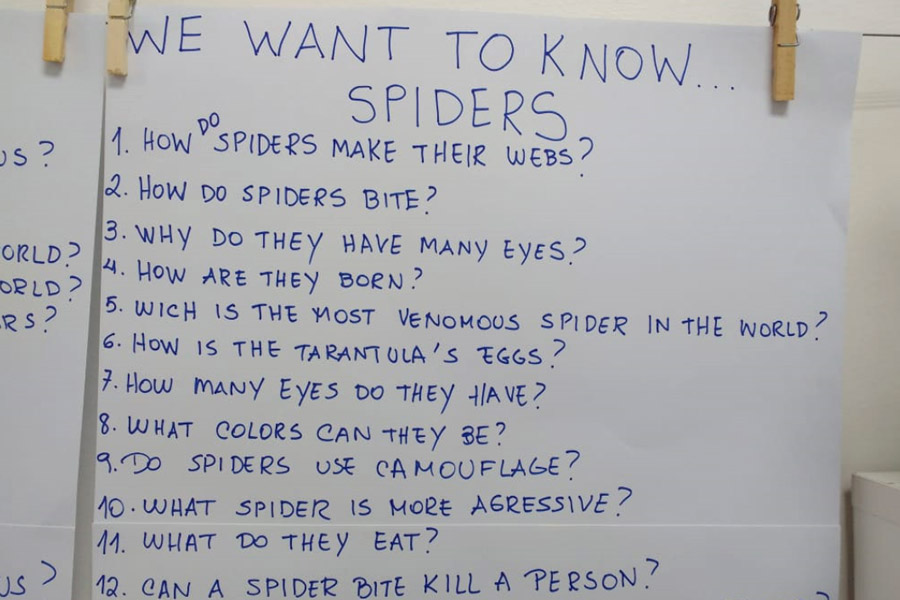 Encontraram tatu bolas, formigas, minhocas, centopeias, joaninhas e aranhas. Quando se depararam com a aranha, uma chuva de perguntas foi feita para a professora Ariane: ela tem veneno? Por que alguns animais têm veneno? De onde vem o veneno? Em que parte do corpo dos animais fica o veneno? Quais são os tipos de veneno? Para que serve esse veneno? O que esses animais comem, como vivem e onde moram? Será que têm boca? O que aconteceria com o planeta Terra se eles desaparecessem? O que devemos fazer se um animal com veneno nos picar/morder?