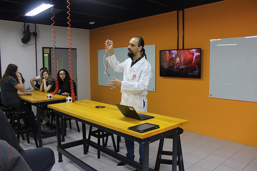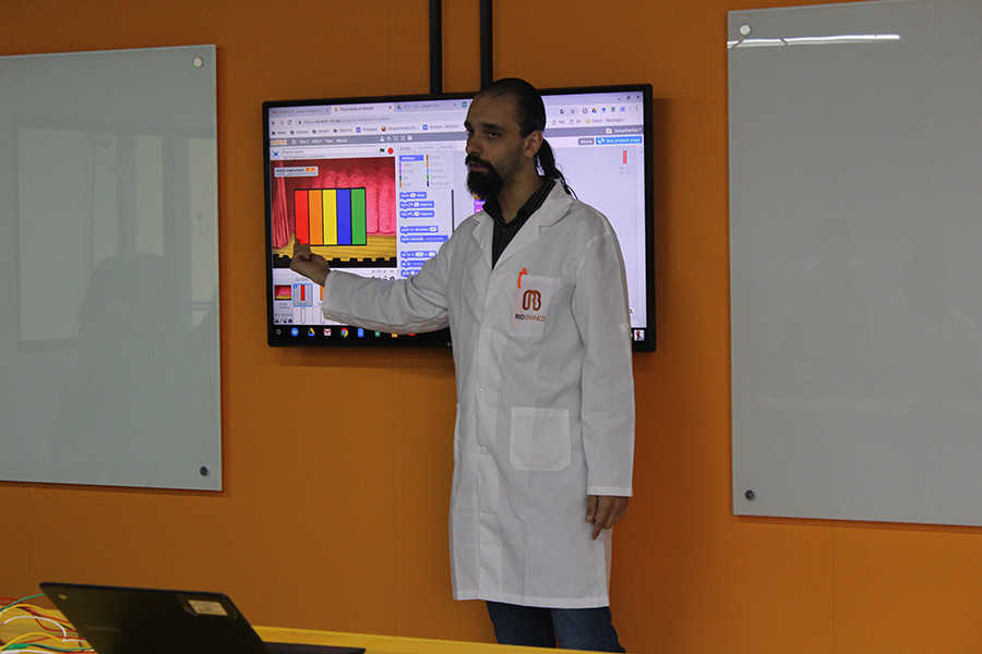 Segundo o professor, a ideia dessa atividade foi proporcionar um primeiro contato dos alunos com elementos, ferramentas e softwares de programação, como por exemplo, o Makey Makey, Scratch e Arduino, para que possam identificar as possibilidades de trabalho para o período final de síntese.