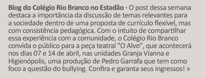 Você está cadastrado na base de dados do Colégio Rio Branco, que respeita a sua privacidade e é contra o spam na rede. Adicione nossos e-mails comunicados@mail.comunicacrb.com.br e frsp-mkt@mkt.frsp.org aos seus contatos para receber com sucesso nossos e-mails. Os assuntos dos e-mails podem, eventualmente, aparecer sem acentuação porque alguns servidores não a reconhecem. Este é um e-mail automático. Por favor, não responda. Para entrar em contato conosco, mande uma mensagem através do nosso canal de relacionamento. Colégio Rio Branco | www.crb.g12.br |