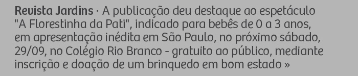 Revista Jardins - A publicação deu destaque ao espetáculo 'A Florestinha da Pati', indicado para bebês de 0 a 3 anos, em apresentação inédita em São Paulo, no próximo sábado, 29/09, no Colégio Rio Branco - gratuito ao público, mediante inscrição e doação de um brinquedo em bom estado.