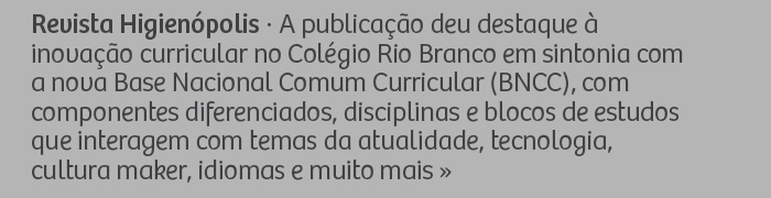 Revista Higienópolis - A publicação deu destaque à inovação curricular no Colégio Rio Branco em sintonia com a nova Base Nacional Comum Curricular (BNCC), com componentes diferenciados, disciplinas e blocos de estudos que interagem com temas da atualidade, tecnologia, cultura maker, idiomas e muito mais.