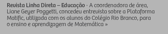 Revista Linha Direta – Educação - A coordenadora de área, Liane Geyer Poggetti, concedeu entrevista sobre a Plataforma Matific, utilizada com os alunos do Colégio Rio Branco, para o ensino e aprendizagem de Matemática.