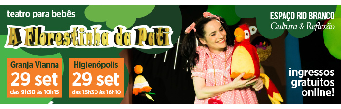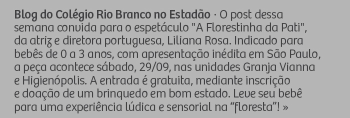 Blog do Colégio Rio Branco no Estadão - O post dessa semana convida para o espetáculo 'A Florestinha da Pati', da atriz e diretora portuguesa, Liliana Rosa. Indicado para bebês de 0 a 3 anos, com apresentação inédita em São Paulo, a peça acontece sábado, 29/09, nas unidades Granja Vianna e Higienópolis. A entrada é gratuita, mediante inscrição e doação de um brinquedo em bom estado. Leve seu bebê para uma experiência lúdica e sensorial na 'floresta'!