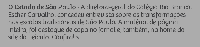 O Estado de São Paulo - A diretora-geral do Colégio Rio Branco, Esther Carvalho, concedeu entrevista sobre as transformações nas escolas tradicionais de São Paulo. A matéria, de página inteira, foi destaque de capa no jornal e, também, na home do site do veículo. Confira! »