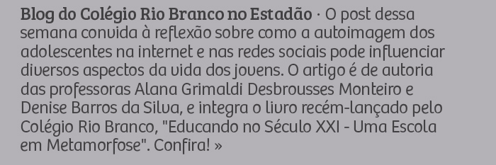 Blog do Colégio Rio Branco no Estadão - O post dessa semana convida à reflexão sobre como a autoimagem dos adolescentes na internet e nas redes sociais pode influenciar diversos aspectos da vida dos jovens. O artigo é de autoria das professoras Alana Grimaldi Desbrousses Monteiro e Denise Barros da Silva, e integra o livro recém-lançado pelo Colégio Rio Branco, "Educando no Século XXI - Uma Escola em Metamorfose". Confira!
