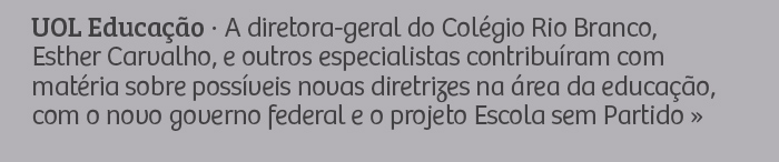UOL Educação - A diretora-geral do Colégio Rio Branco, Esther Carvalho, juntamente com diferentes especialistas, contribuiu com matéria sobre possíveis novas diretrizes na área da educação, com o novo governo federal e o projeto Escola sem Partido.