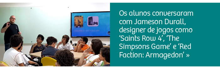 Alunos conversam com Jameson Durall, designer de jogos como The Simpsons Game e Saints Row 4