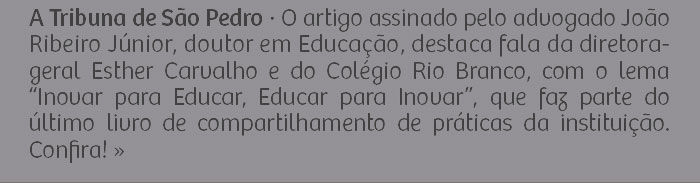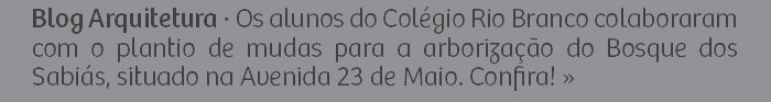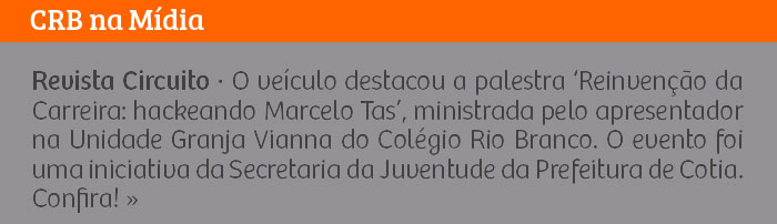 Você está cadastrado na base de dados do Colégio Rio Branco, que respeita a sua privacidade e é contra o spam na rede. Adicione nosso e-mail comunicados@mail.comunicacrb.com.br aos seus contatos para receber com sucesso nossos e-mails. Os assuntos dos e-mails podem, eventualmente, aparecer sem acentuação porque alguns servidores não a reconhecem. Este é um e-mail automático. Por favor, não responda. Para entrar em contato conosco, mande uma mensagem através do nosso canal de relacionamento. Colégio Rio Branco | www.crb.g12.br |